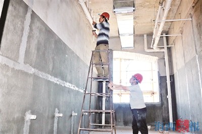 海滄區(qū)臨港高中項(xiàng)目工地,工人正在進(jìn)行室內(nèi)裝修。記者 王曉萍 攝