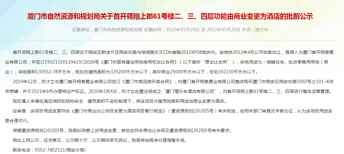 剛剛,廈門市自然資源和規(guī)劃局發(fā)布關(guān)于首開領(lǐng)翔上郡61號樓二、三、四層功能由商業(yè)變更為酒店的批前公示。