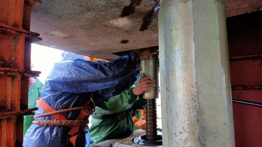 此次完成吊裝的是H12上節(jié)墩臺,高9m, 重 979.4t 。單個墩臺的吊裝流程分為浮吊取吊具,半潛駁出運,浮吊及半潛駁定位,下鉤穿銷,起鉤移船,移船對位,粗鋼筋連接,匹配涂抹接縫膠,下放摘鉤,張拉壓漿等多個環(huán)節(jié)。