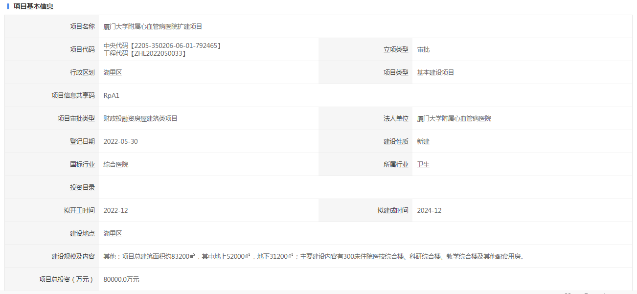 近日,廈門大學(xué)附屬心血管病醫(yī)院擴(kuò)建項(xiàng)目報(bào)建信息公布。