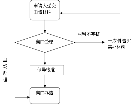 申請人遞交申請材料→窗口受理→領(lǐng)導(dǎo)核準(zhǔn)→窗口辦結(jié)。