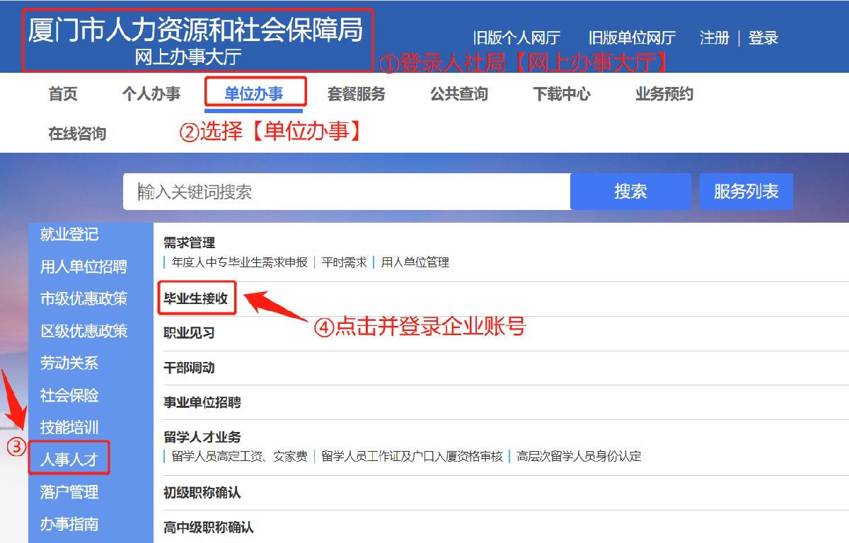 方式二:符合接收條件的畢業(yè)生,由用人單位登錄廈門人社局官網(wǎng)(http://hrss.xm.gov.cn)“網(wǎng)上辦事大廳--單位網(wǎng)廳--人事人才”服務(wù)平臺,根據(jù)提示申報擬接收畢業(yè)生個人信息。
