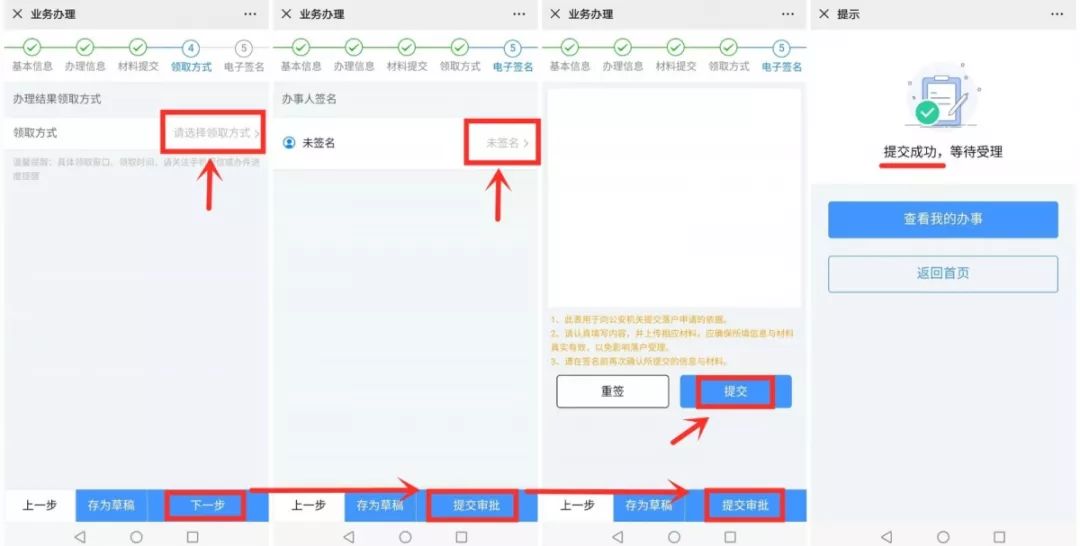 逐步完成材料提交、領(lǐng)取方式選擇、電子簽名確認(rèn)等環(huán)節(jié)后,點(diǎn)擊“提交審批”;