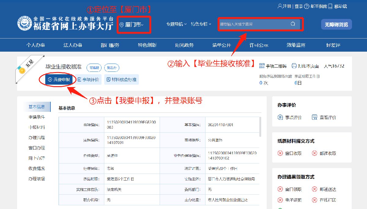 方式一:登錄“福建省網(wǎng)上辦事大廳廈門(mén)分廳” (http://xm.zwfw.fujian.gov.cn),將地址定位至【廈門(mén)市】,在搜索框內(nèi)輸入【畢業(yè)生接收核準(zhǔn)】,點(diǎn)擊【我要申報(bào)】并登錄即可在線辦理。