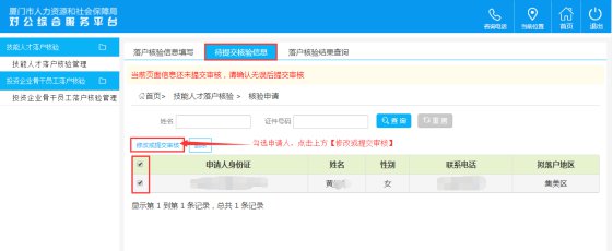 跳到【待提交核驗信息】,勾選申請人,點擊修改或提交審核。如圖: