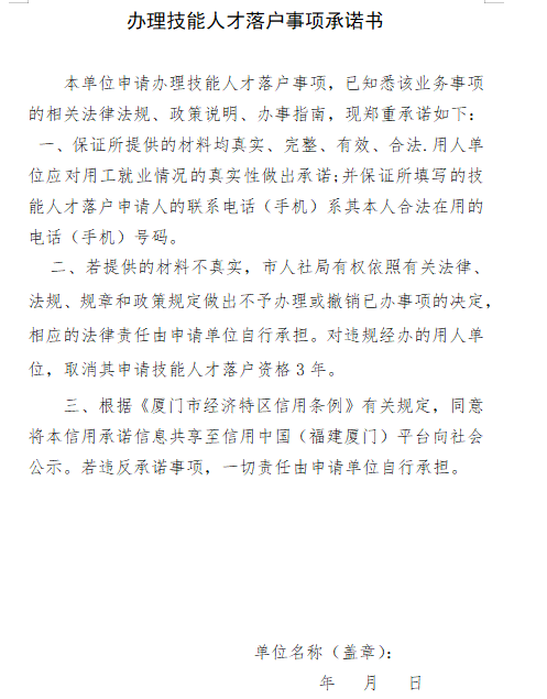 廈門(mén)技能落戶(hù)單位承諾書(shū)下載入口: