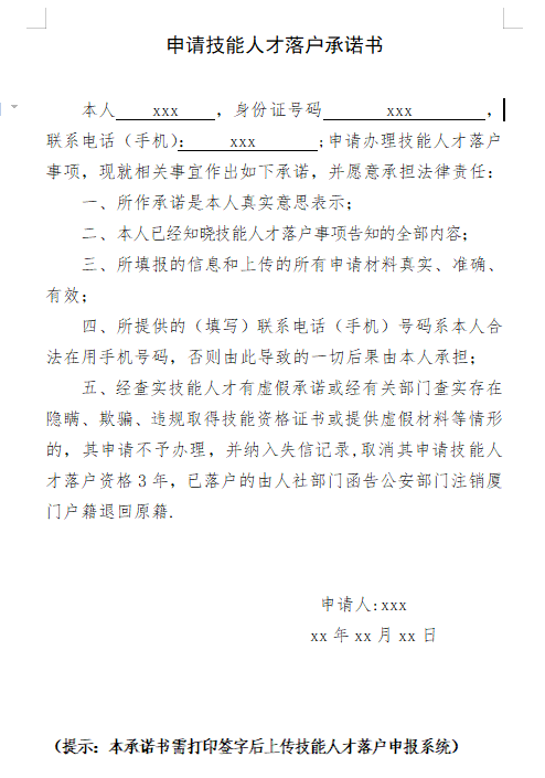 廈門(mén)技能落戶(hù)承諾書(shū)范本: