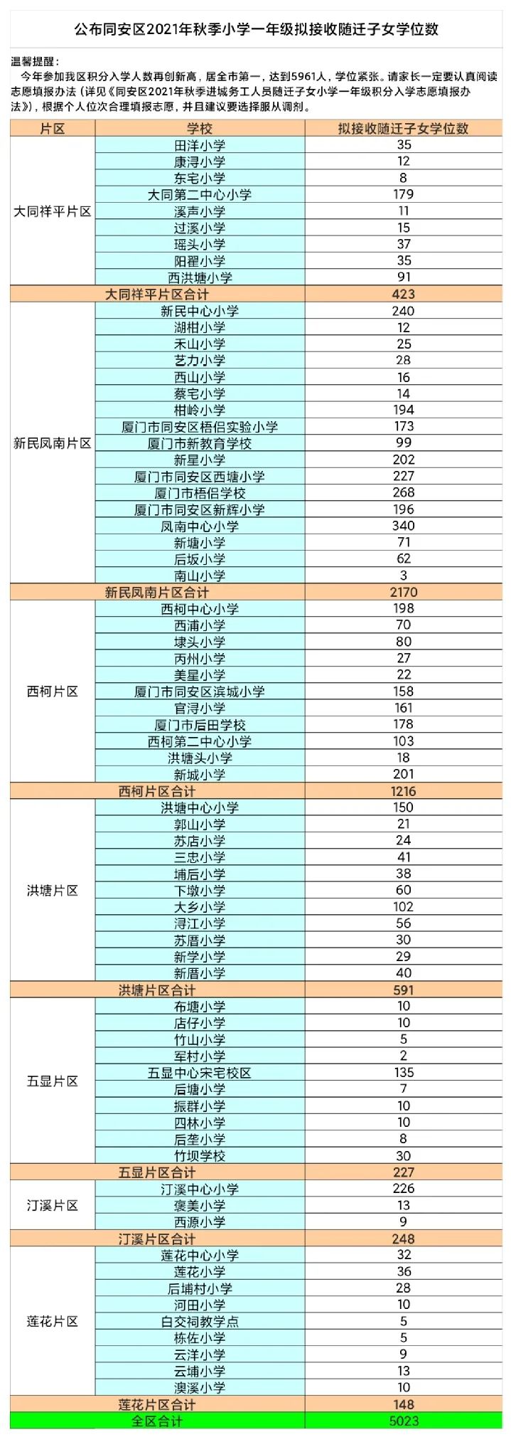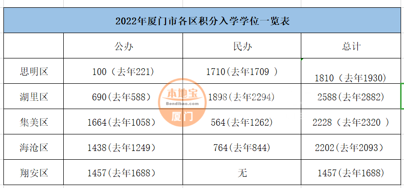 2022年湖里區(qū)、思明區(qū)、集美區(qū)、海滄區(qū)、翔安區(qū)五區(qū)公布了公辦、民辦小學積分入學學校學位情況(如下圖),同安區(qū)暫未公布區(qū)信息小編持續(xù)跟進中~