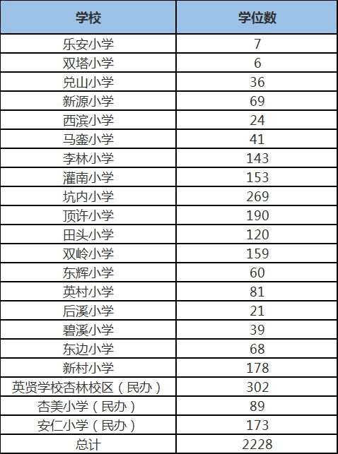 湖里區(qū)2022年積分入學公、民辦小學可提供電腦派位的學位數(shù)為2588個,其中公辦學位690個,民辦學位1898個,具體各校學位情況見下表: