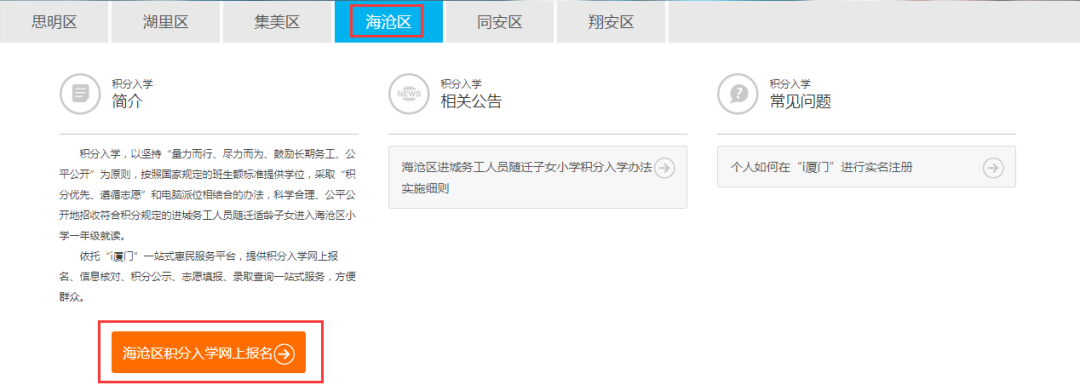 進(jìn)入積分入學(xué)網(wǎng)上報(bào)名界面,選擇“海滄區(qū)”,點(diǎn)擊“積分入學(xué)網(wǎng)上報(bào)名”。