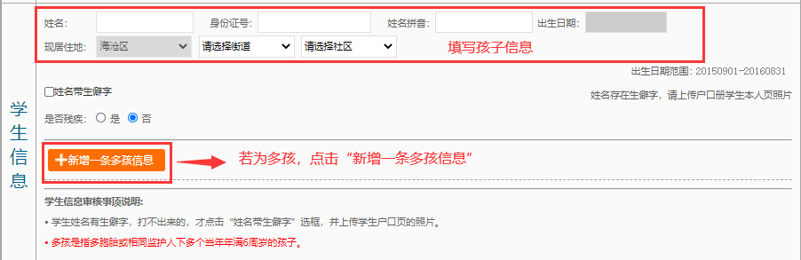 如果是多孩(多胞胎或相同監(jiān)護(hù)人下多個(gè)當(dāng)年年滿6周歲的孩子),點(diǎn)擊“新增一條多孩信息”填寫多孩信息。