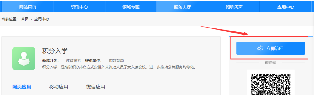 在積分入學(xué)應(yīng)用界面右側(cè),點(diǎn)擊“立即訪問”進(jìn)入報(bào)名登記界面。