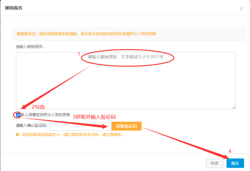 撤銷報(bào)名需注明撤銷原因,勾選本人同意放棄積分入學(xué)的資格,獲取并輸入驗(yàn)證碼后提交,方可撤銷報(bào)名。