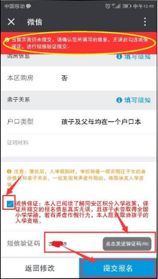 頁(yè)面拉到底端,勾選下方紅色字體部分的保證信息。點(diǎn)擊“發(fā)送驗(yàn)證碼”,將收到的短信驗(yàn)證碼輸入方框內(nèi),然后點(diǎn)擊“提交報(bào)名”,進(jìn)入審核情況界面,即本次報(bào)名成功。