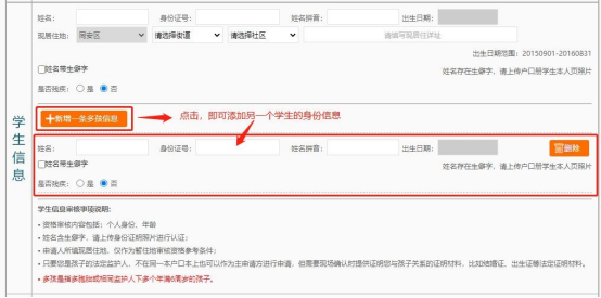 如果今年參加積分入學(xué)的孩子不止一個(gè)(一般指多胞胎或多個(gè)年滿6周歲的孩子),點(diǎn)擊“新增一條多孩信息”輸入另一孩子的姓名、身份證號(hào)。