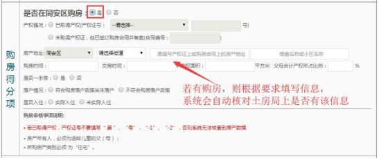 如果在“本區(qū)購(gòu)房”中選擇“是”,則需要填寫實(shí)際的房產(chǎn)信息。并認(rèn)真閱讀填寫須知。