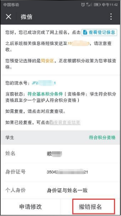 溫馨提示:撤銷報(bào)名后,在報(bào)名期間仍可重新參加積分入學(xué)報(bào)名。