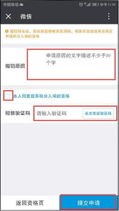 因個(gè)人原因,不再參加積分入學(xué),可點(diǎn)擊“撤銷報(bào)名”。撤銷報(bào)名需注明撤銷原因,填寫驗(yàn)證碼,方可撤銷報(bào)名 溫馨提示: