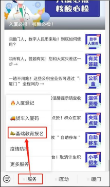 點(diǎn)擊“i 廈門”微信公眾號(hào)左下角的“i 服務(wù)”,找到“基礎(chǔ)教育報(bào)名”點(diǎn)擊進(jìn)入就會(huì)出現(xiàn)積分入學(xué)的入口,點(diǎn)擊“積分入學(xué)”進(jìn)入報(bào)名登記界面。點(diǎn)擊“網(wǎng)上報(bào)名”,進(jìn)入“登記聲明”界面開始網(wǎng)上報(bào)名。
