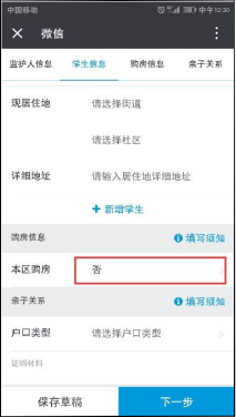 接下來是“購(gòu)房信息”登記。在“本區(qū)購(gòu)房”中選擇“否”,直接進(jìn)行下一步親子關(guān)系。