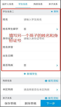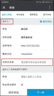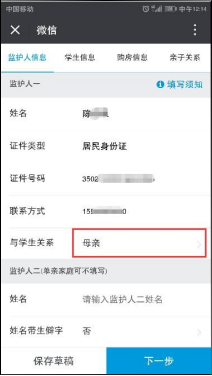 填寫監(jiān)護(hù)人二的姓名,選擇證件類型,填寫證件號(hào)碼、聯(lián)系電話,并選擇與學(xué)生的關(guān)系。