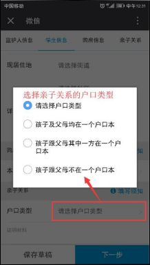 進(jìn)行學(xué)生信息登記。填寫學(xué)生姓名、身份證號(hào),姓名拼音、出生日期會(huì)根據(jù)填寫的姓名與身份證號(hào)自動(dòng)填充。填寫現(xiàn)居住地址和詳細(xì)地址。
