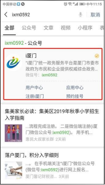 打開微信,點(diǎn)擊微信右上角的搜索框輸入“ixm0592”,點(diǎn)擊“搜尋ixm0592”,找到“i 廈門”官方賬號(hào)進(jìn)入公眾號(hào)并關(guān)注。