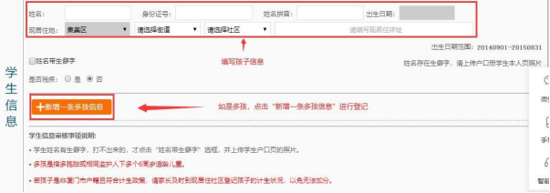 如果學(xué)生姓名帶有生僻字,需要勾選“姓名帶生僻字”進(jìn)行戶口本學(xué)生本人頁照片上傳。如果今年參加積分入學(xué)的孩子不止一個(gè)(一般指雙胞胎或三胞胎及以上),點(diǎn)擊“新增一條多孩信息”輸入另一孩子的姓名、身份證號(hào)。