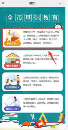 1.3 報(bào)名入口1、登錄i 廈門一站式綜合服務(wù)平臺(tái),找到“基礎(chǔ)教育報(bào)名”的滾動(dòng)圖片點(diǎn)擊進(jìn)入后,找到“積分入學(xué)”點(diǎn)擊進(jìn)入積分入學(xué)頁面進(jìn)行報(bào)名登記,如下圖: