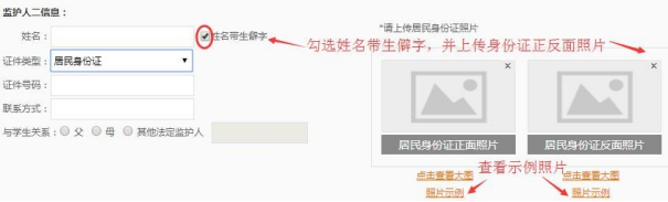 1、監(jiān)護(hù)人姓名有生僻字打不出來的,姓名帶生僻字處才選擇“是”,并點(diǎn)擊圖片上傳監(jiān)護(hù)人身份證正反面照片(圖8)。