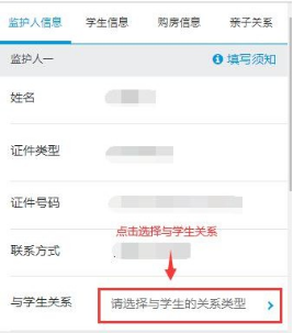 監(jiān)護(hù)人一信息是根據(jù)注冊(cè)賬號(hào)時(shí)填寫的身份證信息自動(dòng)獲取,無需再填寫,只需填寫與學(xué)生關(guān)系,點(diǎn)擊》選擇與學(xué)生的關(guān)系類型(圖6)。