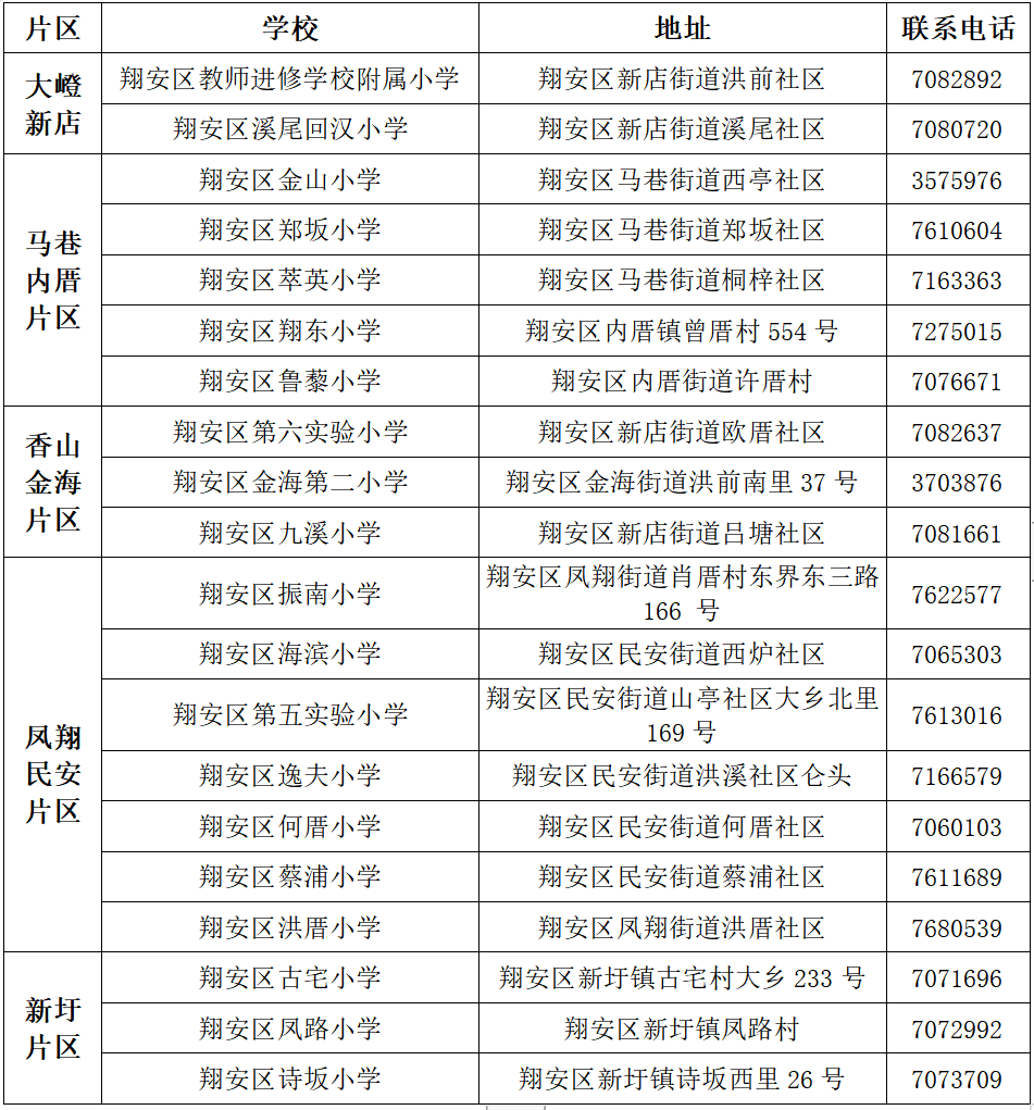 翔安區(qū)2022年秋季小學積分入學便民服務登記點一覽表