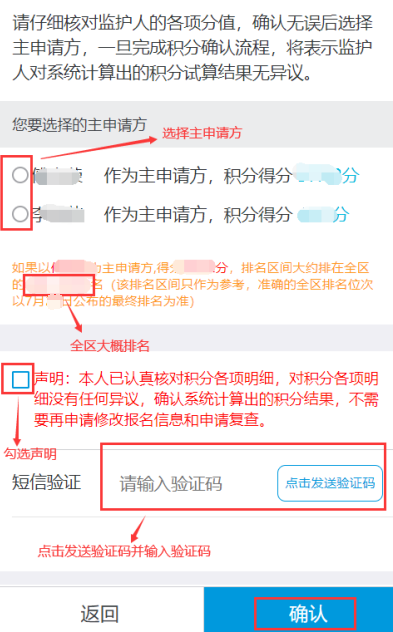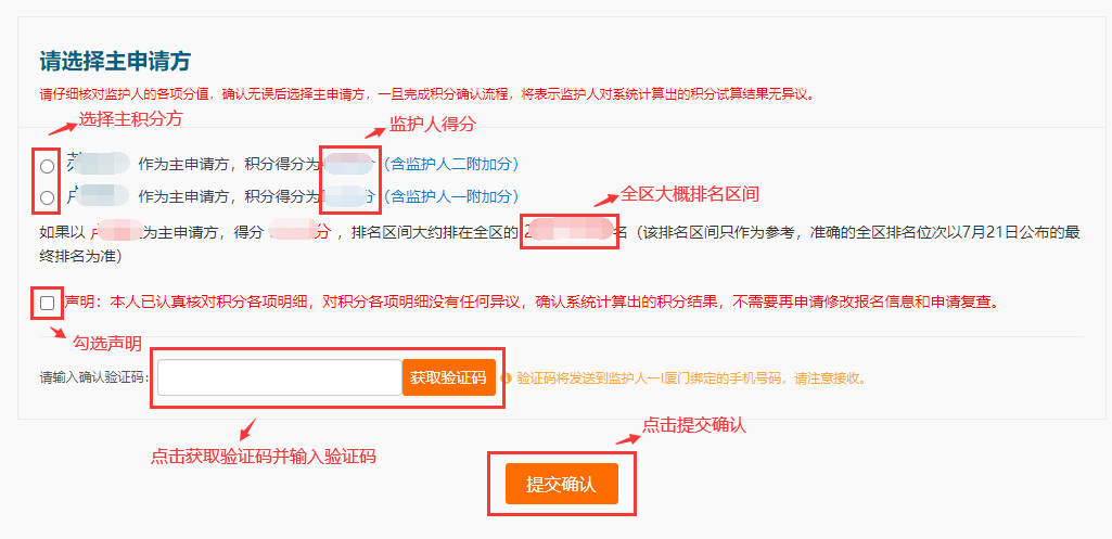 3、各項(xiàng)積分都確認(rèn)無誤后,選擇積分較高的監(jiān)護(hù)人作為主申請(qǐng)方,并在點(diǎn)選確認(rèn)聲明,獲取并輸入收到的驗(yàn)證碼,提交確認(rèn)。