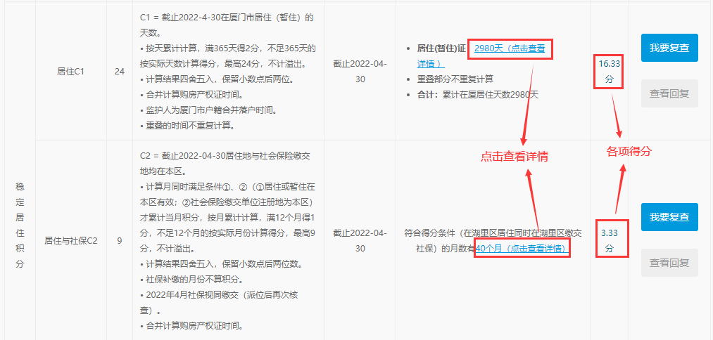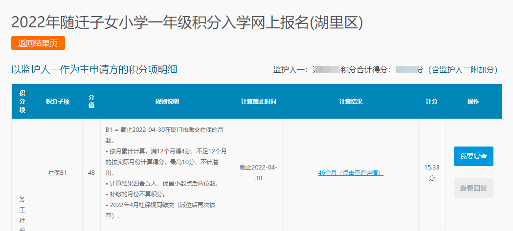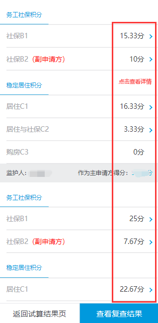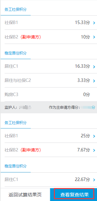 2、積分試算界面會(huì)顯示分別以兩個(gè)監(jiān)護(hù)人為主申請(qǐng)人的分?jǐn)?shù)。點(diǎn)擊右方“查看積分明細(xì)及復(fù)查”的可以查看積分得分明細(xì)。