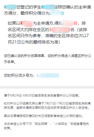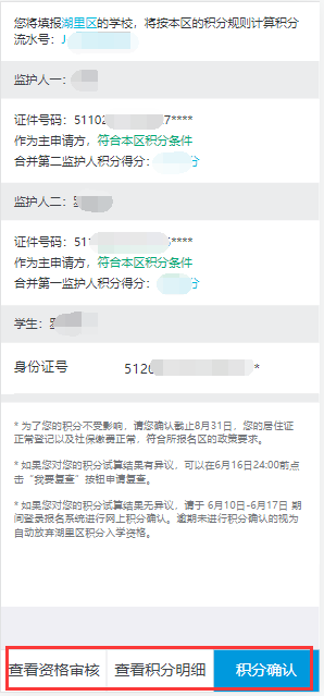 溫馨提醒: 積分確認(rèn)界面會(huì)顯示一個(gè)積分排名區(qū)間,這是系統(tǒng)默認(rèn)以每個(gè)申請(qǐng)人中積分較高的一方進(jìn)行的排名,該排名所在區(qū)間僅供參考,準(zhǔn)確排名以7月21日公布的最終排名為準(zhǔn)。同時(shí)提醒,請(qǐng)排名靠后的申請(qǐng)人做好回戶籍地入學(xué)的準(zhǔn)備。