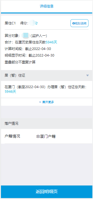 2、積分試算界面會(huì)顯示分別以兩個(gè)監(jiān)護(hù)人為主申請(qǐng)人的分?jǐn)?shù)。點(diǎn)擊屏幕下方“查看積分明細(xì)”按鈕,可以查看各項(xiàng)得分詳情,界面上分別列出了各積分項(xiàng)的具體分?jǐn)?shù),點(diǎn)擊每一項(xiàng)可以進(jìn)入詳細(xì)界面。