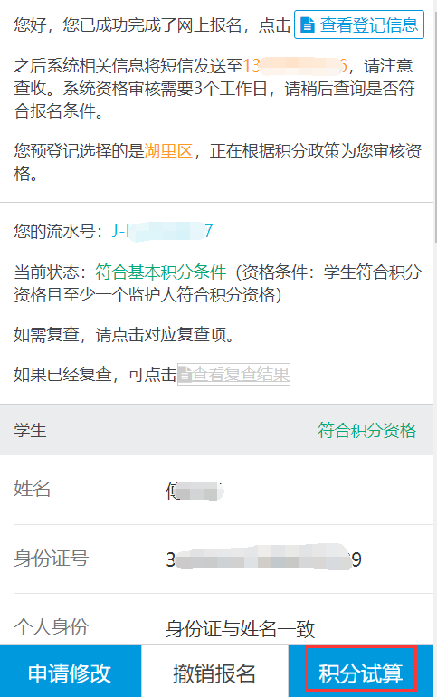 溫馨提示:如果您的微信界面中沒有“積分試算”按鈕,則表示兩個(gè)監(jiān)護(hù)人都不符合湖里區(qū)積分入學(xué)的基本條件(具體哪項(xiàng)不符合可以查看系統(tǒng)界面中的資格審核表),不能參加湖里區(qū)積分入學(xué)電腦派位。請(qǐng)這部分隨遷子女家長務(wù)必盡早聯(lián)系戶籍所在地學(xué)校就讀。