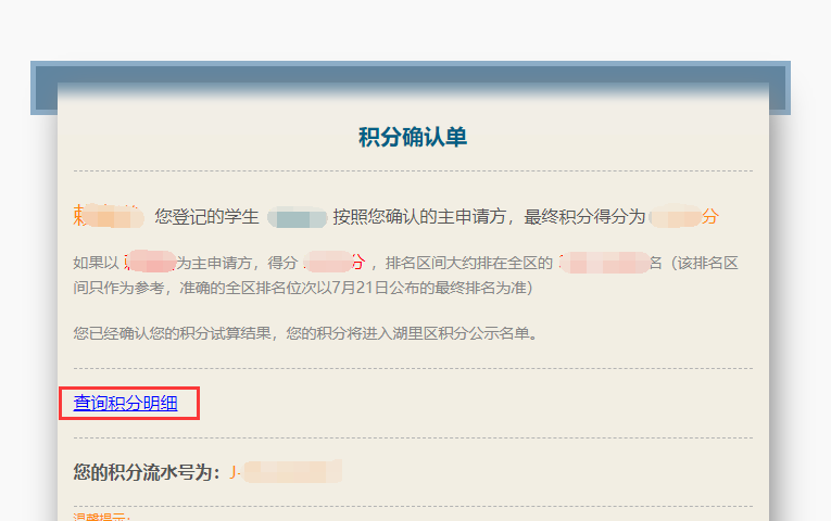 溫馨提示:積分確認(rèn)界面會(huì)顯示一個(gè)積分排名區(qū)間,這是系統(tǒng)默認(rèn)以每個(gè)申請(qǐng)人中積該排名所在區(qū)間僅供參考,準(zhǔn)確排名以7月21日公布的最終排名為準(zhǔn)。同時(shí)提醒,請(qǐng)排名靠后的申請(qǐng)人做好回戶籍地入學(xué)的準(zhǔn)備。