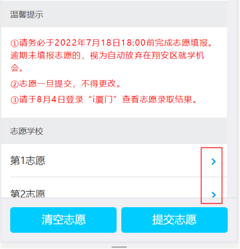 3.填報方式:網(wǎng)絡填報。登錄“i廈門服務平臺”(網(wǎng)址:https://ixm.xm.gov.cn)或微信公眾號“i廈門”,進入之前戶籍預約報名成功界面。根據(jù)提示從19所學校選擇填報。根據(jù)您填報的順序,分為第一志愿、第二志愿、第三志愿……為確保每位戶籍適齡兒童能被錄取,系統(tǒng)設置為10個志愿必須填滿。具體操作如下: