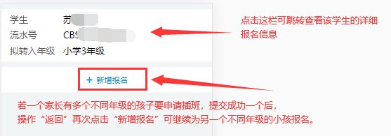 如果一個(gè)家長(zhǎng)有多個(gè)不同年級(jí)的孩子要申請(qǐng)轉(zhuǎn)學(xué),提交成功一個(gè)后,點(diǎn)擊“返回”后,再次點(diǎn)擊“新增報(bào)名”可繼續(xù)為另一個(gè)不同年級(jí)的小孩報(bào)名。