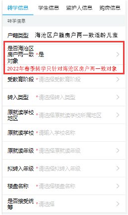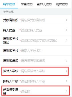 轉(zhuǎn)學(xué)信息須填寫(xiě):受教育階段(小學(xué)或初中)、轉(zhuǎn)入類型、原就讀學(xué)校地區(qū)、原就讀學(xué)校、原就讀年級(jí)、擬轉(zhuǎn)入年級(jí)和是否接受統(tǒng)籌等信息。