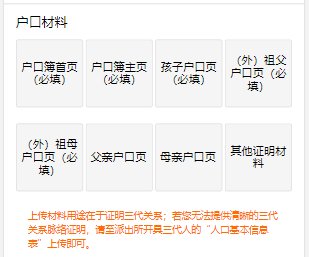 ?。?)若產(chǎn)權(quán)為學(xué)生(外)祖父母購(gòu)房的,根據(jù)招生文件三代戶口須同冊(cè)的要求,須上傳孩子所在戶口簿首頁(yè)、戶主頁(yè)、孩子戶口頁(yè)、父母戶口頁(yè)、產(chǎn)權(quán)所屬(外)祖父母的戶口頁(yè)等材料。