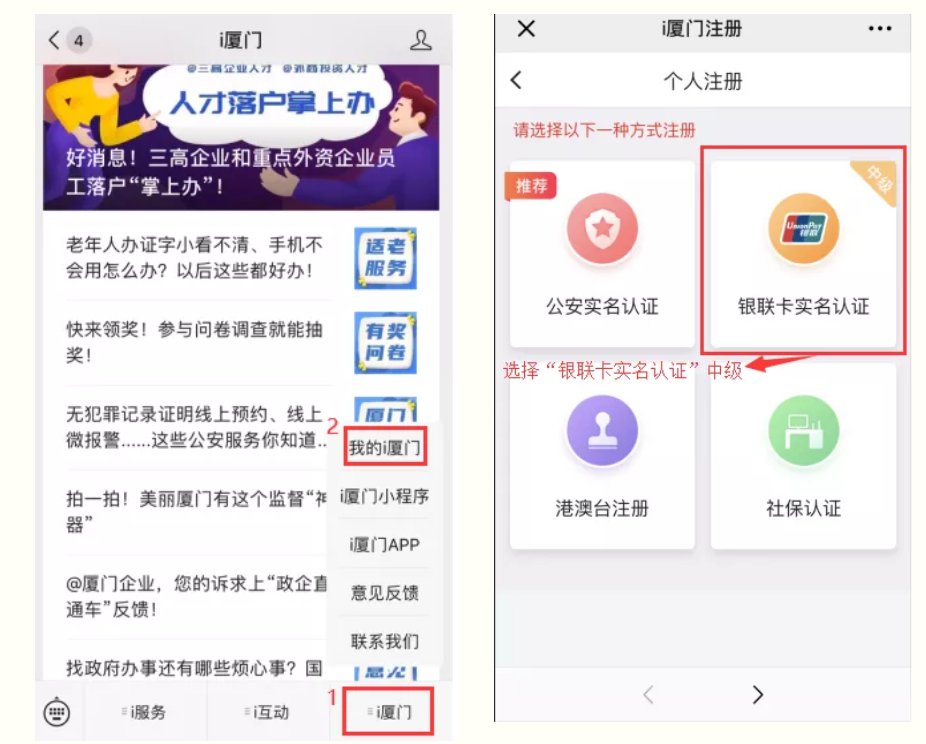 1.微信關(guān)注“i廈門”公眾號(hào)(ixm0592),進(jìn)入公眾號(hào),如還未注冊(cè)i廈門賬號(hào),點(diǎn)擊右下角的“i廈門”選擇“我的i廈門”點(diǎn)擊“注冊(cè)”,選擇“銀聯(lián)卡實(shí)名認(rèn)證”,即可完成注冊(cè)和中級(jí)實(shí)名認(rèn)證操作。賬號(hào)應(yīng)以學(xué)生監(jiān)護(hù)人的信息進(jìn)行注冊(cè),切勿使用申請(qǐng)學(xué)生的信息注冊(cè)。