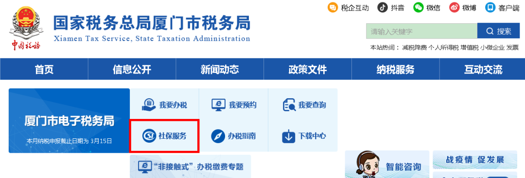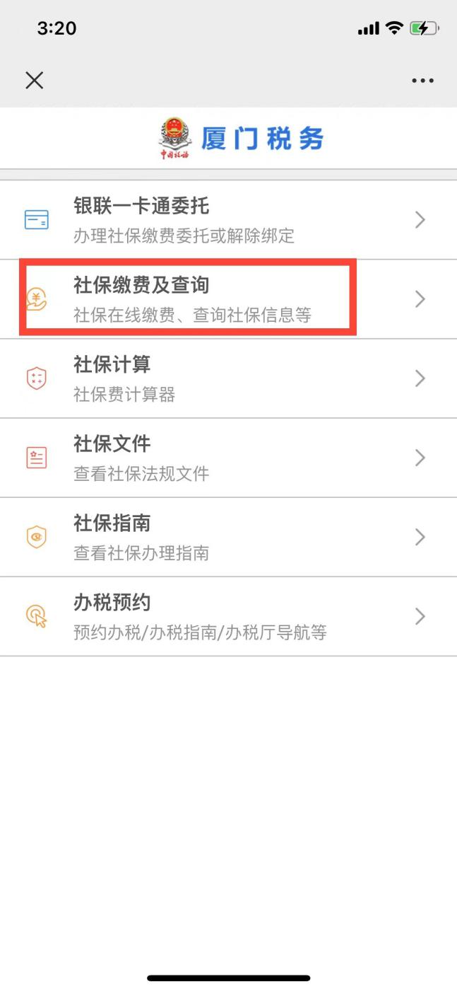 方法一:關(guān)注“廈門稅務(wù)”公眾號(hào),通過“掌上辦稅”→“社保服務(wù)”→“社保繳費(fèi)及查詢”。
