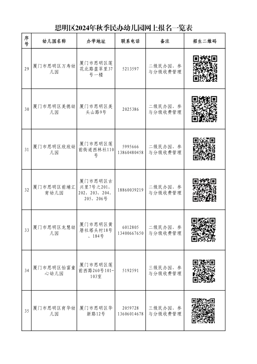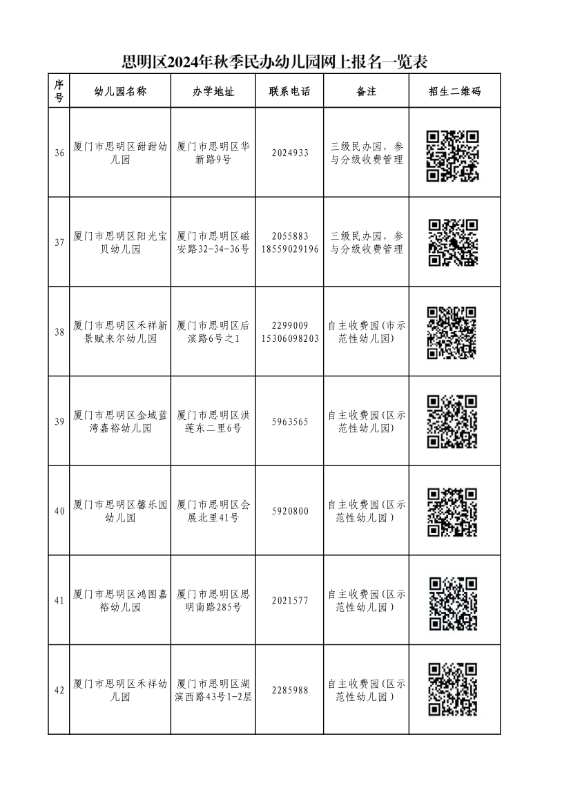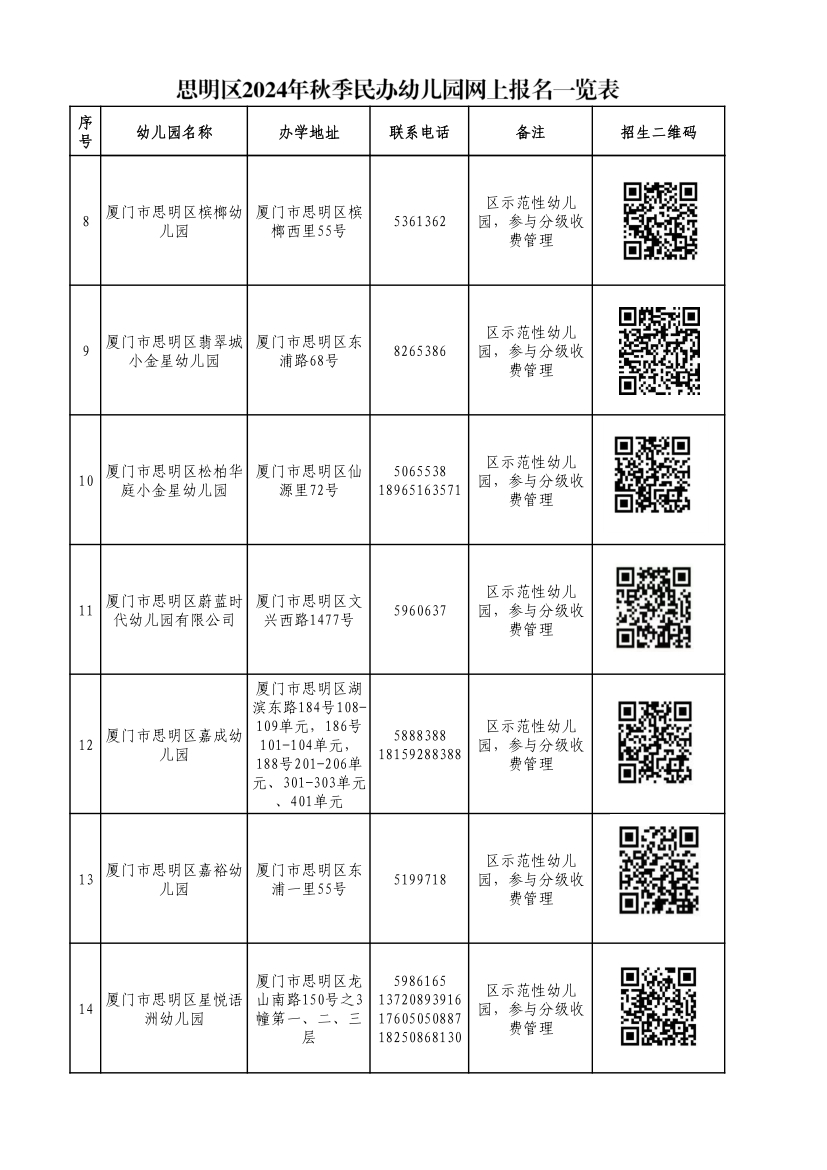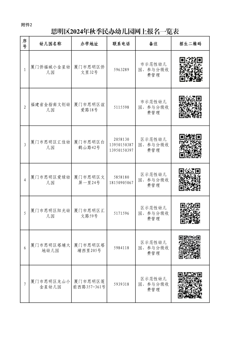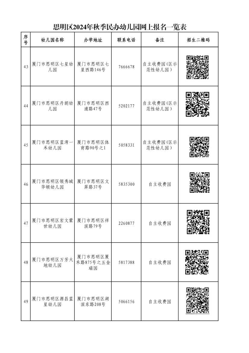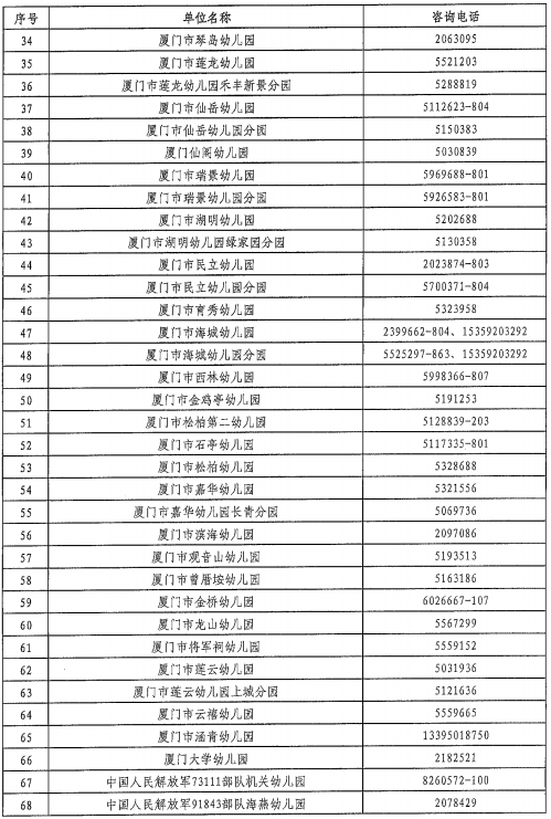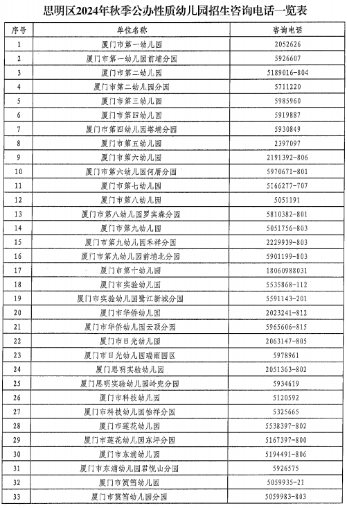 思明區(qū)2024年秋季公辦性質(zhì)幼兒園招生咨詢電話一覽表