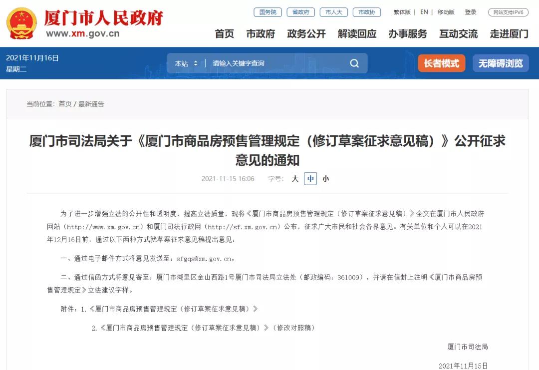 就在2021年11月15日,廈門市政府網(wǎng)站發(fā)布關(guān)于《廈門市商品房預(yù)售管理規(guī)定(修訂草案征求意見稿)》(以下簡稱《意見稿》)公開征求意見稿。《意見稿》內(nèi)容涉及商品房的預(yù)售條件、預(yù)售資金監(jiān)管等。