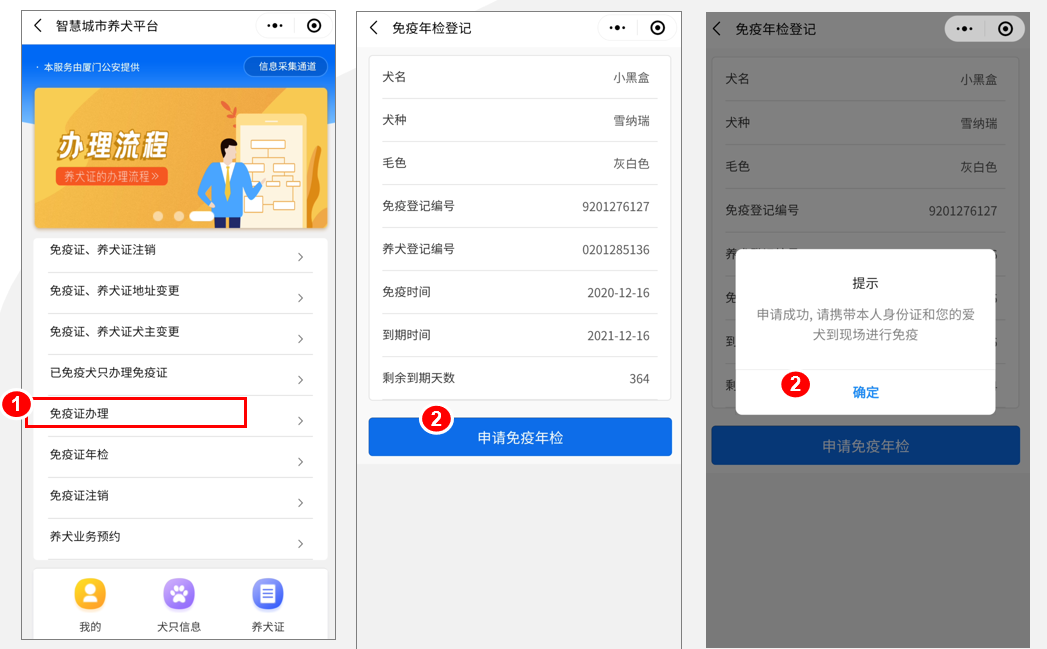 已持有免疫證,且免疫證是在廈門養(yǎng)犬辦證窗口或農(nóng)業(yè)農(nóng)村部門授權(quán)的動(dòng)物醫(yī)院辦理